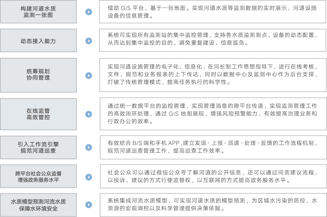 智慧河道綜合管理平臺(tái)是以物聯(lián)網(wǎng)、移動(dòng)通信技術(shù)等先進(jìn)技術(shù)為基礎(chǔ),以水系治理為核心,面向河道管理運(yùn)營部門構(gòu)建的一套河道信息化監(jiān)控管理平臺(tái),平臺(tái)可實(shí)現(xiàn)河道基礎(chǔ)數(shù)據(jù)信息的管理、實(shí)時(shí)斷面監(jiān)測(cè)數(shù)據(jù)的展現(xiàn)、河道水質(zhì)的模擬預(yù)測(cè),并結(jié)合手機(jī)APP實(shí)現(xiàn)河道的精細(xì)化管理。系統(tǒng)的建設(shè)可更加高效安全整合水務(wù)信息及資源,更加科學(xué)的實(shí)現(xiàn)河道水務(wù)的監(jiān)測(cè)、預(yù)警、分析和決策,建立更高水平的水務(wù)設(shè)施遠(yuǎn)程控制和智能化執(zhí)行能力,最終達(dá)到保障河流水質(zhì)安全、提高河道管理效率的目的。